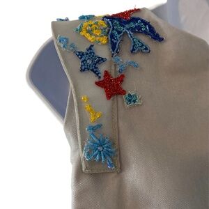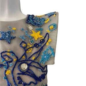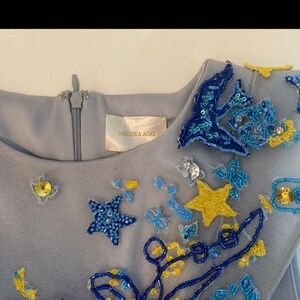 Mischka Aoki custom-made baby blue gown. Hand sewn with colorful beaded details and embroidered fairytale phrases.