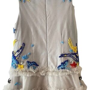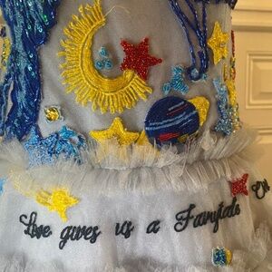 Mischka Aoki custom-made baby blue gown. Hand sewn with colorful beaded details and embroidered fairytale phrases. The Stars of Heaven collection.