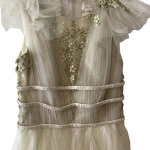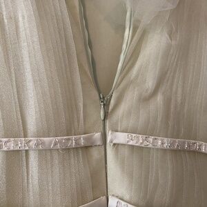 Mischka Aoki custom-made soft green tulle gown with embroidered flower details.