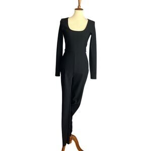 This chic designer l jumpsuit is in a flattering thick ponte knit fabric, skinny leg with a split hem, missing original belt. cocktail parties, holiday parties, new years, honeymoon, vacation, cruise, minimalist, quiet luxury, clubs, rehearsal dinner, bachelorette, engagement party, dinner dates