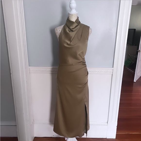 MISHA COLLECTION Robbia Satin High Neck Draped Midi Dress In Dusty Olive Size 4