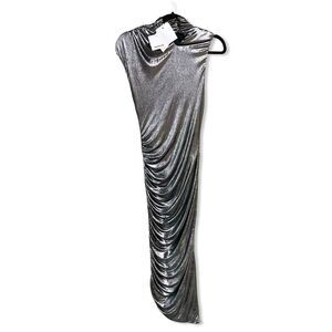MISHA Revolve chase dress Silver Asymmetrical Ruched Midi metallic As Is S