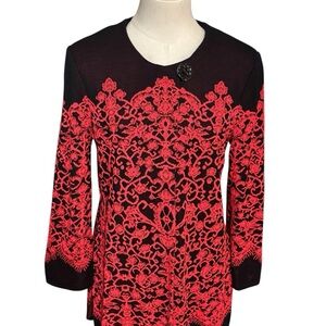 MISOOK Lace Print Long Jacket Cardigan Sweater Red Black Size S Button Work