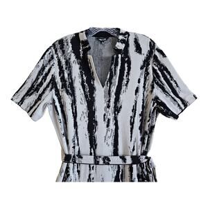 MISOOK Women's Size L Dress - Brushstroke Pattern, Black, Gray, V-Neck, Short Sleeve, Tie Belt, 52% Rayon, 48% Polyester