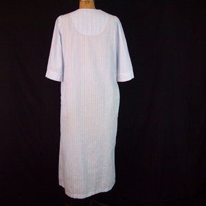 This zip front robe by Miss Elaine is in a seersucker stripe done in blue, pink and white. Embroidery on the bodice. Zip up front with a white metal ring pull. Pockets in each side seam.