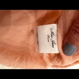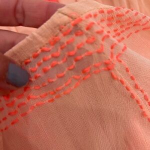 color is a tan sheer fabric w/ a peachy/pink embroidery & matching stitching & tassels
