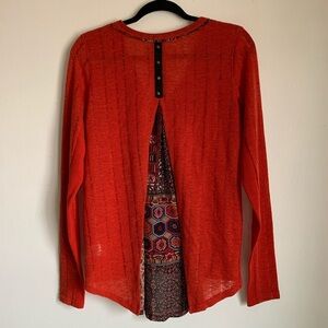 Knit burnt orange sweater with an embellished neckline and button up front, with a fabric back panel in a geometric design.