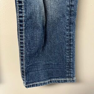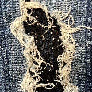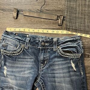 Super cute very distressed miss me jeans, embellished black inserts stones on the inserts skull buttons on the back pockets and front closure size 30 approximately 29 inch inseam, tag says capri