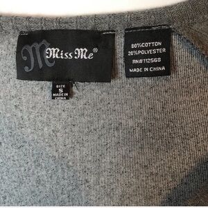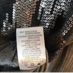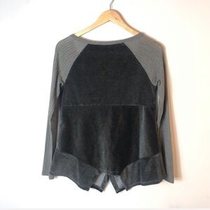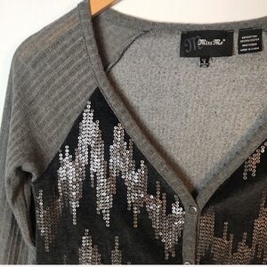 Ash gray velour sequin knit cardigan. Unique divided hem feature. Button front. Medium weight. 2 front pockets.