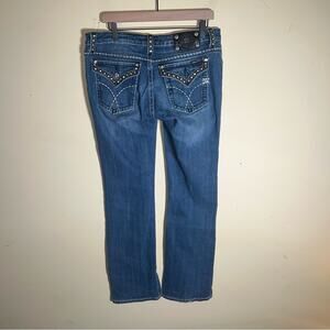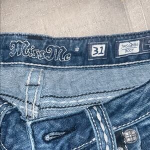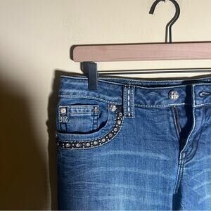 Stylish blue denim jeans by Miss Me. Features classic stitching and button details.