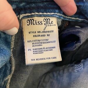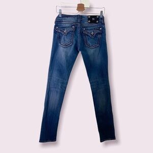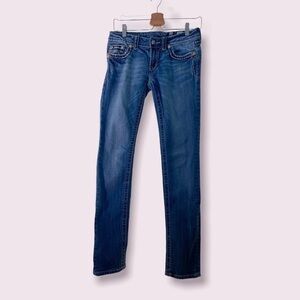 These are a wonderful pair of skinny jeans. These jeans have the classic Miss Me detailed design on the pockets with heavy detailing throughout. These jeans have button flap closure back pockets. They are a nice medium wash and have some nice wiskering and manufactured distress. These jeans are the JS5014532 style or the "skinny".