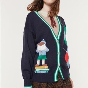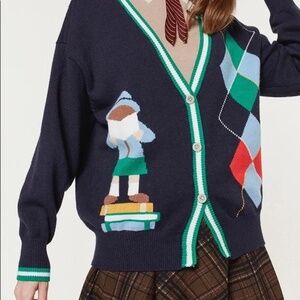 If you're looking for a way to amp the "cuteness" factor to your outfit, indoors or out, this cardigan will do exactly that! Features a "miss patina" logo at the back and with a faceless cartoon character at the back and right side.