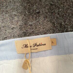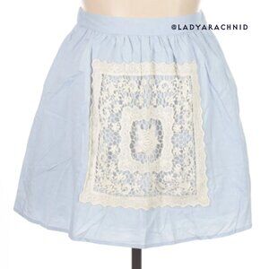 Charming blue mini skirt adorned with a delicate ivory lace panel. Fully lined with an attached slip for modesty. Pull on styling with no zippers to fuss with. Back waistband is elasticated to allow for several inches of stretch. Measures 14" across the waist and 18" waist to hem lying flat and unstretched. New with tags condition. Feel free to ask any questions. Smoke free home but we do have pets. BIN10