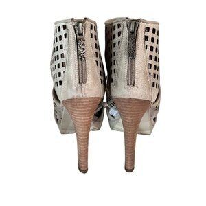 Dress up your evening with these stylish high heels from Miss Sixty. Lavish leather upper with laser cut-outs. Leather lining. Ankle cuff with a back-zip closure for easy on and off. Open toe. Leather covered platform measures approximately 1". Stacked heel measures approximately 4.5". Feels like a 4" heel. Ribber sole.