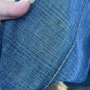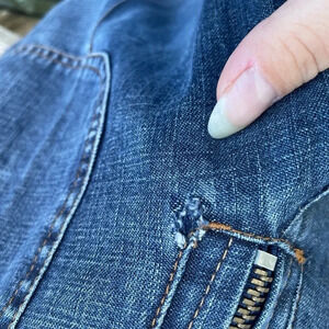 Pre owned. Two minor flaws. There is a tiny hole in corner of front zipper - needs a little bit of stitch work. There is also a small spot on one leg (all pictured).