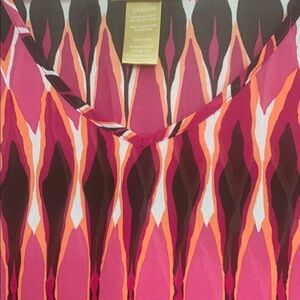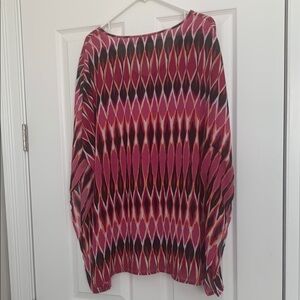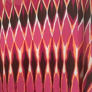 This MISS TINA swimsuit coverup/ top features a striking pink and black graphic pattern, offering a relaxed fit perfect for casual occasions. The bold design is woven into the fabric, ensuring a lasting impression with its eye-catching geometric style. Can be used with a belt or without a belt. Has belt holes Excellent condition. No rips or stains. Size Large (12- 14) (see photos)