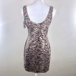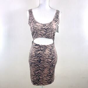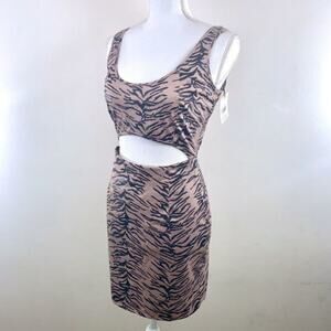 A faux suede mini dress by Missguided™ featuring an allover tiger print, a scoop neckline, sleeveless cut, midsection cutout, bodycon silhouette, and a concealed back zipper.