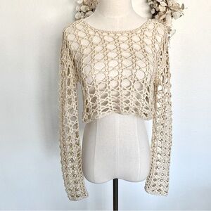 Beautifully intricate crochet on this sweater ! Even the rope is braided ! It is cropped length . Great to wear as a swimsuit / bikini coverup or with a bralette underneath .