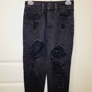 riot style mom jeans in a washed finish with distressed fray detailing.