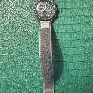 🚀 With its intense deep gray color and metallic gray VELCRO® strap, this non-limited watch means business. The chronograph seconds hand, subdial hands and tachymeter scale are in white. The subdials and bezel are in black. All dials in the collection carry the OMEGA X Swatch branding, the iconic Speedmaster logo and the MoonSwatch logo. The biosourced glass construction, the etched "S" integrated in the center of the glass, the fine and sophisticated circular pattern on the dial outer ring and the recessed subdials, the angular and smooth lugs construction, the iconic “dot over 90” detail on the tachymeter scale, and of course the unique Bioceramic feel are common to all models. The hour, minute, and chronograph seconds hands as well as the hour markers sport Super-LumiNova® for a perfect glow in the dark.