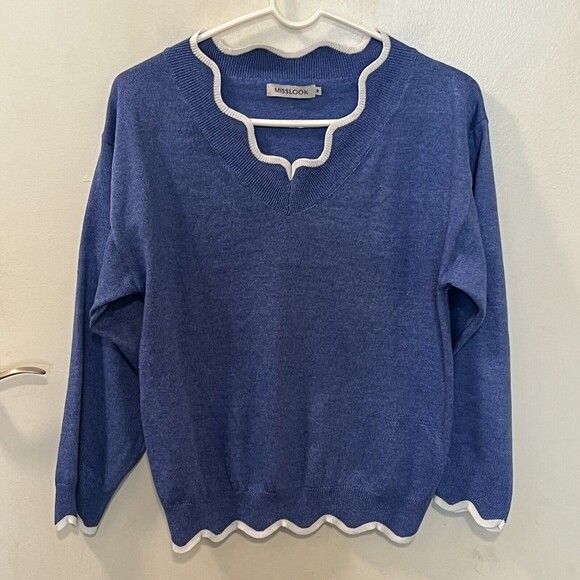 MISSLOOK Womens Blue Knitted Wool Pullover Sweater Scallop Hem Size Medium