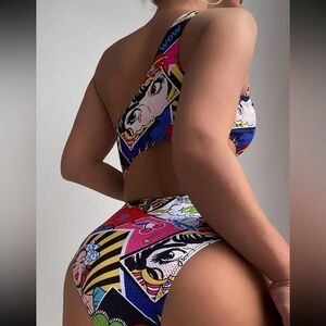 Vibrant one-piece swimsuit with pop art design. Features bold graphics and cut-out detail. Perfect for a stylish beach look.