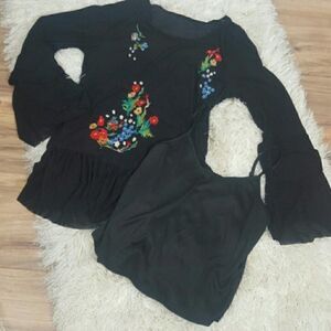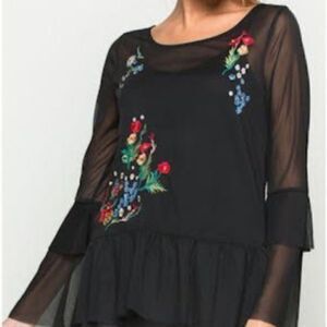 Miss Love Women's Embroidered Mesh Top with Ruffled Sleeves. Cami removable