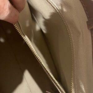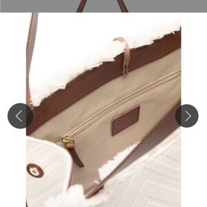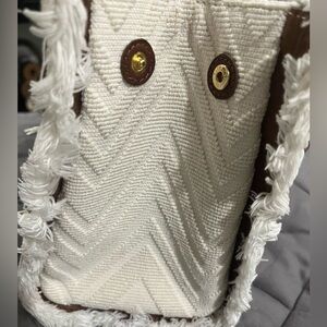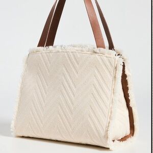 Light beige/camel brown leather trim signature zigzag woven design logo patch to the front frayed detailing two leather shoulder straps main compartment internal logo patch internal zip-fastening pocket full lining top tie fastening.