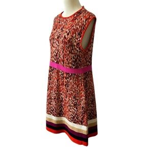 Orange, black white abstract pattern, womens size Medium based on my measurements, wool blend, sleeveless, back zipper and hook eye clasp, knee length, A-line silhouette.