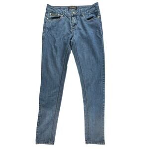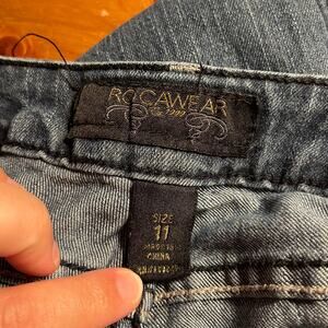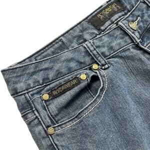 A pair of vintage Rocawear light washed skinny jeans from the 2000s, juniors size 11. Could also fit women's medium to large, check measurements to be sure! In excellent preloved condition. They have a slightly low rise since they are authentic y2k jeans. Features the logo on the back pockets. Would be a great christmas gift for vintage lovers!