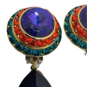 Elevate your style with these stunning Mistar Bijoux 1980s clip-on earrings, featuring vibrant blue teardrop glass crystals suspended from dazzling circular tops. The intricate design showcases a central large blue stone encircled by rings of orange and deep teal rhinestones, all set in a rich golden-toned base. Perfect for adding a touch of vintage glamour and bold color to any ensemble, these earrings are a true statement piece. Earrings measure approx. 2-3/4 inches tall and are stamped Mistar Bijoux on backs, great condition