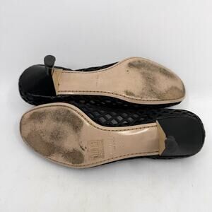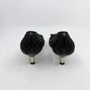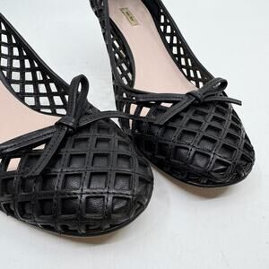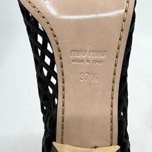 Details: Genuine Miu Miu designer kitten heels featuring a round toe and black laser-cut mesh leather in a ballet flat style. Covered toe, bow detail on the vamp, and unique tapered silver metal-capped low heel. Elegant, chic, mod, coquette, office siren, and balletcore style. Made in Italy. MSRP $570.