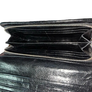 This elegant wallet features the brands iconic matelassé motif in calf skin leather characterized by its vintage craquele finish, a texture that creates a sophisticated, three-dimensional effect. The flap opens to 6 card slots, 1 bill compartment, 1 document slip pocket, and a large all-around zip compartment. The zip compartment includes 2 main open gusseted compartments, 8 card slots, and 2 bill pockets.
