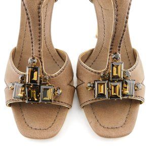 MIU MIU Crystal Gemstone Embellishment Brown T-strap Heel Pump Sandals 38.5