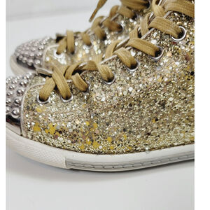 MIU MIU Gold Glitter High Tops w Silver Studded Cap Toe Sneakers, sz 38 EU/ 8 US