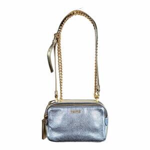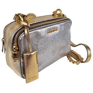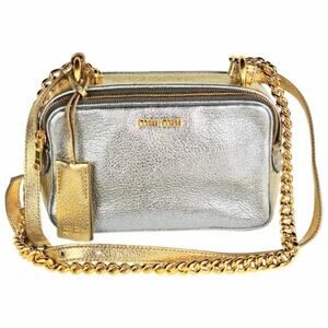 MIU MIU Silver Gold Leather Camera Crossbody Bag. MSRP $2,700. This bag is a limited edition from the Holiday Collection 2016. It is made of two-tone pebbled leather (silver and gold). It has two zipper compartments, one interior slip pocket, and a gold logo plate. The adjustable strap is leather and chain-link. There is a gold hangtag and gold lettering on the front of the bag. The bag includes a COA. It can be worn as a crossbody or double-up strap as a shoulder bag.