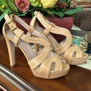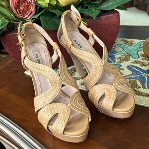 MIU MIU Leather Platform High Heels Neutral Tan Stitched Peep Toe Slingback