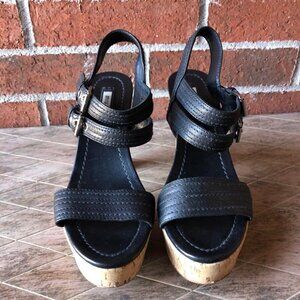Italians are known for producing the best leather goods and these sandals are doubly exceptional! Very chic wide double straps in double stitched black Nappa Leather, a sexy ankle sling back strap with double silver metal buckles, and a comfy leather lining. Perfect for the fashionista who loves soaring heights with a sexy 4.5”H cork heel and 1.5”H cork platform that will elevate everything from a little black dress to jeans, shorts, and mini skirts…