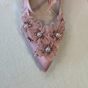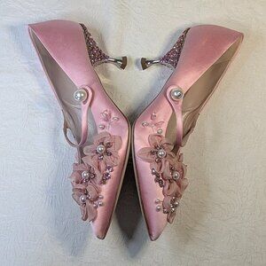 Unique NWOB Satin Pumps with Stiletto, with a Mary Jane strap affixed with a Pearl. The Stiletto is encrusted with crystals. The embellishments are floral applique with pearls and crystals. All crystals, pearls and applique appear in excellent condition.