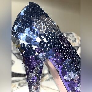 Details: Slight discoloration at interior; 2 missing sequin embellishments at heel on left shoe (see photos).