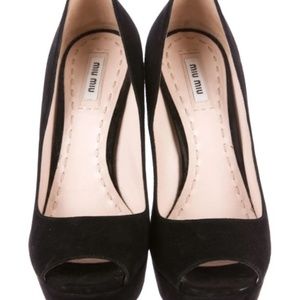 Black suede Miu Miu peep-toe pumps with covered platforms and heels.