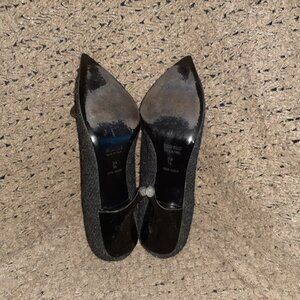 MIU MIU-Black Tweed Pointed-Toe Pump w/ Floral Design on Patent Toe-Sz 38.5-EX