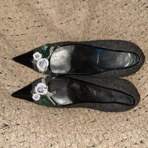 MIU MIU-Black Tweed Pointed-Toe Pump w/ Floral Design on Patent Toe-Sz 38.5-EX Excellent pre-owned condition as shown... Size 38.5, about an 8, measures 10.5" via insole with 3.9" stiletto heel and 3.25" wide. Elevate your ensemble with the Miu Miu Black Tweed Pointed-Toe Pump, a harmonious blend of sophistication and flair. Crafted in Italy, these pumps feature a luxurious fabric upper complemented by a chic floral pattern on the patent toe, adding a touch of bohemian elegance to your look. The pointed toe design and sleek stiletto heel exude a modern vibe, perfect for a variety of occasions from business meetings to weddings. Comfort is not compromised in this stylish piece, boasting a cushioned insole and a lined interior for a seamless fit. The pump's lightweight construction paired with a cap toe accent ensures both comfort and durability. Grosgrain ribbon and three-dimensional flowers further embellish the shoe, making it a standout addition to your wardrobe that can carry you through any season in style.