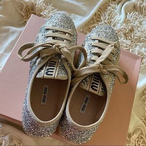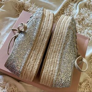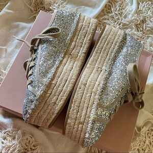 Brand New Miu Miu Silver Glitter Logo Lace Up Platform Espadrille Sneakers (Size 39, Color Argento)