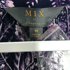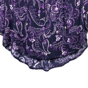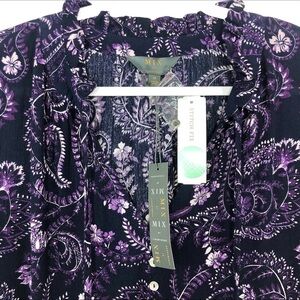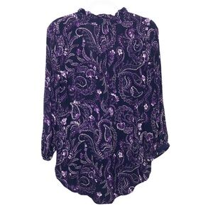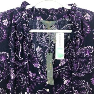Stitch Fix Mix By 41 Hawthorn Angola Ruffle Neck Top. In the color dark purple. Floral print. 3/4 button cuff sleeves. Ruffle tie neckline. High low hemline. Lightweight material.
