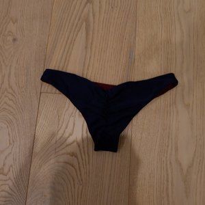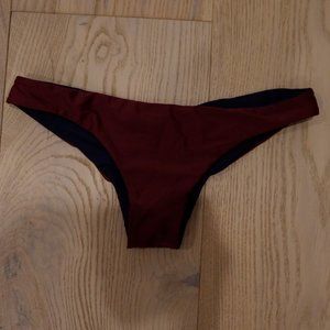 ○ Reversible, cheeky, navy/burgundy cheeky bathing suit bottoms.