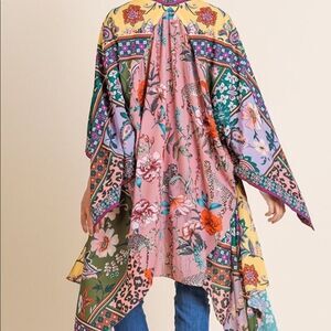 Mixed Scarf Print Angel Sleeve Open Front Kimono with Sharkbite Hem