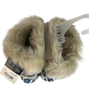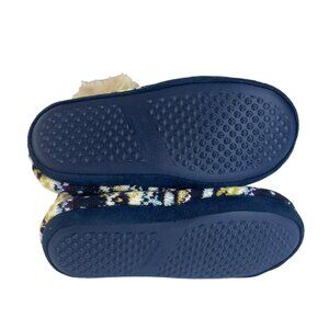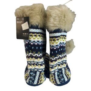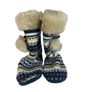 MIXIT Fuzzy Knit Boot Slippers Blue Fair Isle Pom-Poms Non-Slip Medium 7/8 New