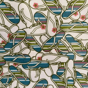 MIXX | tote bag. MIXX (from Portland, Oregon). Laminated canvas tote bag. Flip flop sandal/shoe print. Colors: blue, pink, like green and white. 2 - 1.25” webbed shoulder straps, 10” to top of bag. Size: 14.5”x14.5”x4.5”. It’s a coated (protected), laminated canvas. There’s a light stain on the interior (see photo). The inside 2 slide in pockets. The sides have 2 snap closures to widen or loosen the bag. Great beach bag! Good, used condition.