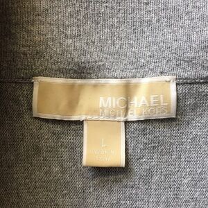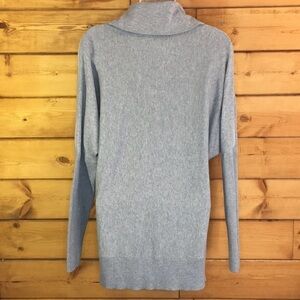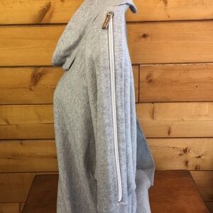 From MICHAEL Michael Kors, gray cowl neck sweater with silvertone functional zipper detail atop the shoulders. Long batwing sleeves gather to a wide-banded hem. Care tag is missing, but material is a cotton/viscose/nylon blend (from website). Very good normal wash/wear condition. No stain or flaws.
